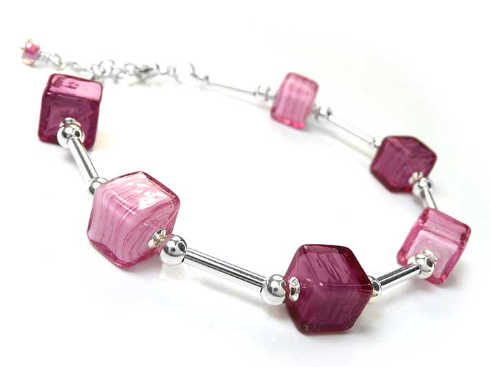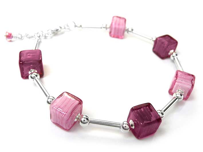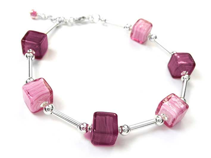 A pretty sterling silver and Murano glass bracelet made with 8mm cube Murano beads in dark raspberry sorbet and rose. These Murano beads are so pretty with a white core at the centre of the glass. We've added sterling silver tubes and beads and finished it off with a lobster clasp and chain to provide the best fit for you. Easy to wear adding lots of colour to your day!