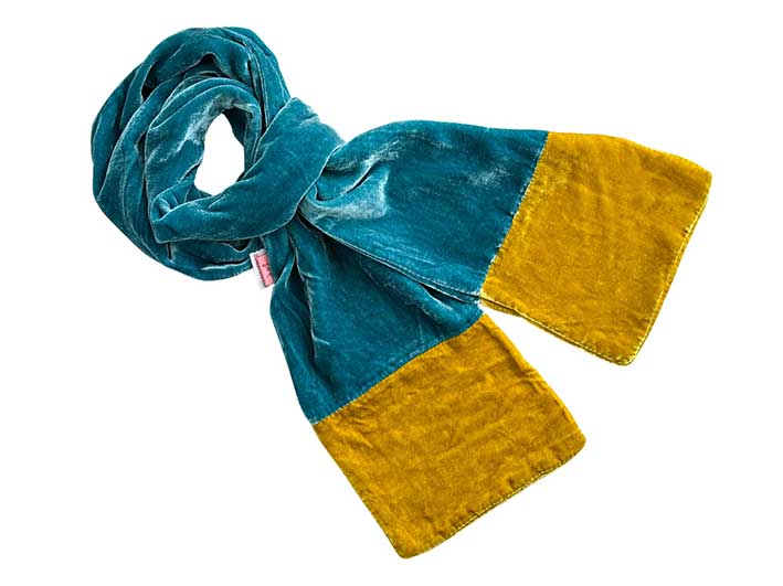 Rich teal velvet flows into vibrant mustard ends in this striking two-tone scarf. The plush texture and luminous sheen give it an opulent feel, while the colour combination is fresh and contemporary. Perfect for enhancing a simple outfit or adding a statement finish to your winter layers. Pairs beautifully with our purses and accessories for a coordinated look. Measuring 165cm x 17cm. Materials: 82% viscose, 18% silk.